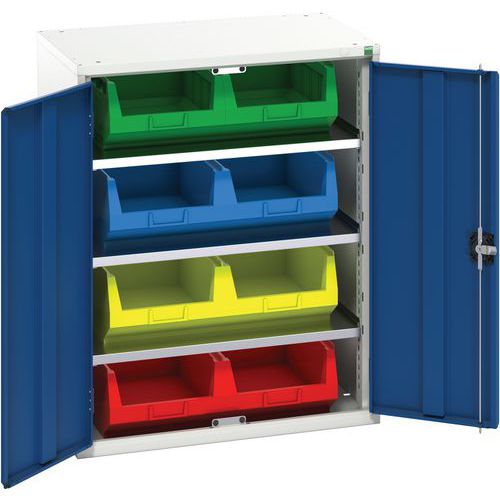 Műanyag dobozokkal felszerelt fém műhelyszekrények kisebb anyagokhoz. Hegesztett acélszerkezet, porszórt felületkezelés. Horganyzott polcok 75 kg teherbírással, 25 mm-es lépésekben állítható magassággal. Megerősített lengőajtók hárompontos hengerzárral két kulccsal. Műanyag dobozokkal együtt szállítva No. 5 HxSzxM: 19 x 30,3 x 48,5 cm (színkeverék).