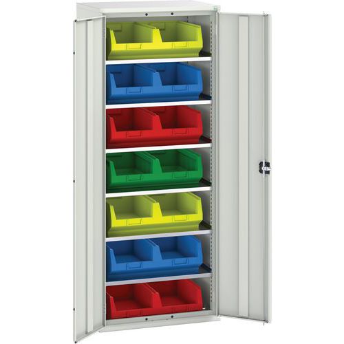 Műanyag dobozokkal felszerelt fém műhelyszekrények kisebb anyagokhoz. Hegesztett acélszerkezet, porszórt felületkezelés. Horganyzott polcok 75 kg teherbírással, 25 mm-es lépésekben állítható magassággal. Megerősített lengőajtók hárompontos hengerzárral két kulccsal. Műanyag dobozokkal együtt szállítva No. 5 HxSzxM: 19 x 30,3 x 48,5 cm (színkeverék).