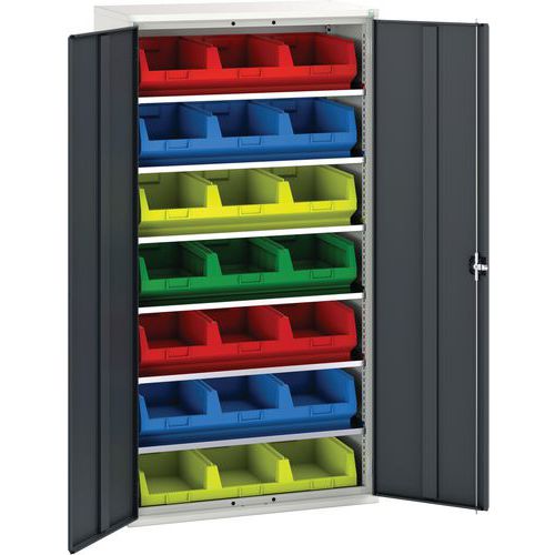 Műanyag dobozokkal felszerelt fém műhelyszekrények kisebb anyagokhoz. Hegesztett acélszerkezet, porszórt felületkezelés. Horganyzott polcok 75 kg teherbírással, 25 mm-es lépésekben állítható magassággal. Megerősített lengőajtók hárompontos hengerzárral két kulccsal. Műanyag dobozokkal együtt szállítva No. 5 HxSzxM: 19 x 30,3 x 48,5 cm (színkeverék).