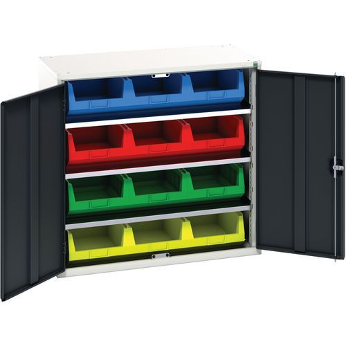 Műanyag dobozokkal felszerelt fém műhelyszekrények kisebb anyagokhoz. Hegesztett acélszerkezet, porszórt felületkezelés. Horganyzott polcok 75 kg teherbírással, 25 mm-es lépésekben állítható magassággal. Megerősített lengőajtók hárompontos hengerzárral két kulccsal. Műanyag dobozokkal együtt szállítva No. 5 HxSzxM: 19 x 30,3 x 48,5 cm (színkeverék).