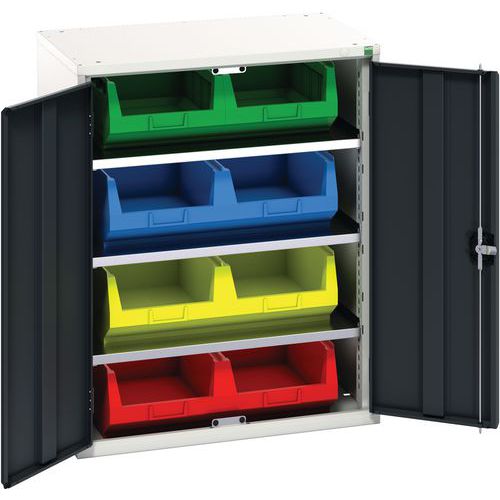 Műanyag dobozokkal felszerelt fém műhelyszekrények kisebb anyagokhoz. Hegesztett acélszerkezet, porszórt felületkezelés. Horganyzott polcok 75 kg teherbírással, 25 mm-es lépésekben állítható magassággal. Megerősített lengőajtók hárompontos hengerzárral két kulccsal. Műanyag dobozokkal együtt szállítva No. 5 HxSzxM: 19 x 30,3 x 48,5 cm (színkeverék).