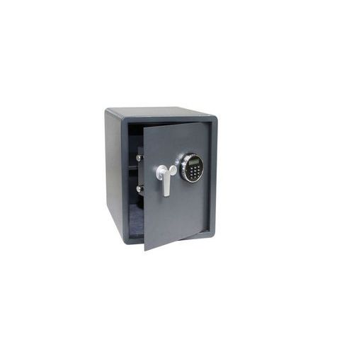 Acél bútorszéf elektronikus zárral és riasztóval, háttérvilágítású LCD kijelzővel és karral a nyitáshoz. Hangriasztás három sikertelen kódkombináció esetén. A riasztó aktiválható a széf jogosulatlan kezelése esetén is. Beállítható master kód. Falra vagy padlóba rögzíthető. Műanyag vezérlőkar.