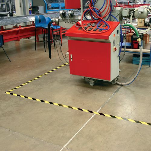 Vinil öntapadó padlószalag a munkaterület megjelölésére raktárakban és ipari üzemekben. Szakítószilárdság 22 N/cm, szalag nyúlása 180%. Beltéri használatra alkalmas.