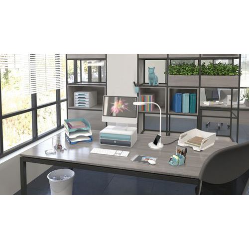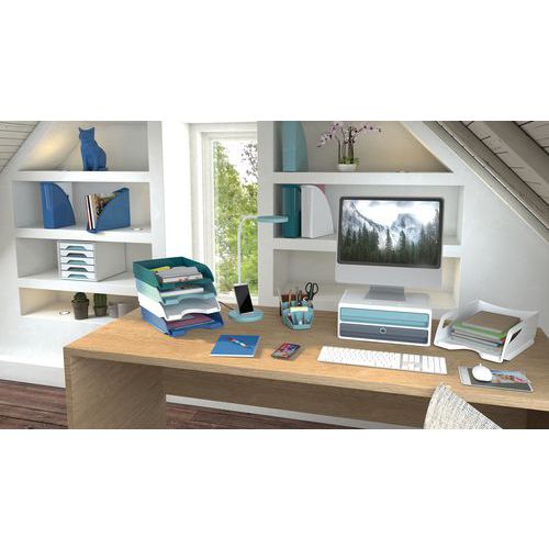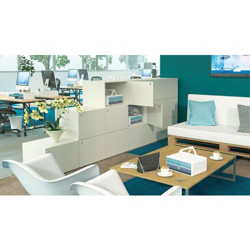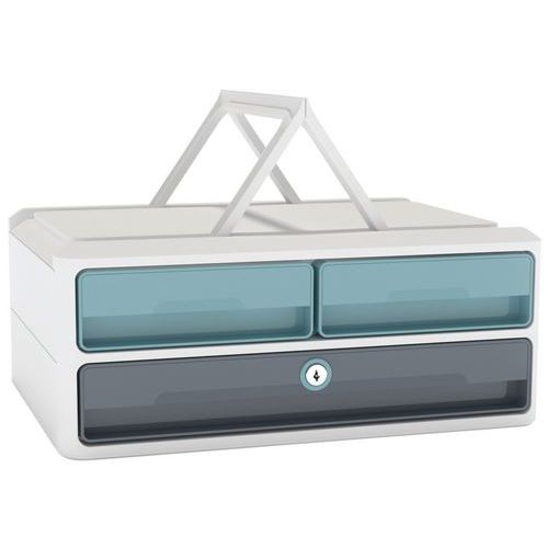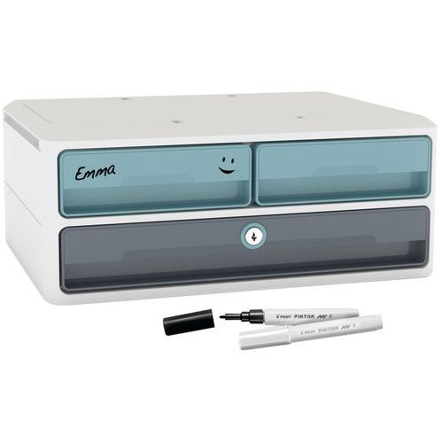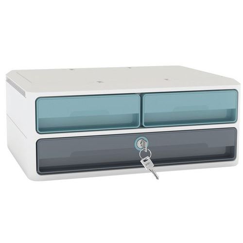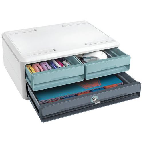 Moov'Up egységek két kisebb fiókkal és egy nagy fiókkal az irodai kellékektől a dokumentumokig vagy táblagépekig bármi tárolására. A fiókok indexelhetők és testreszabhatók vízbázisú markerrel. A modulok rendkívül robusztusak és képernyőállványként is használhatók (5 kg-ig). A fiókok zárhatók, és van egy nyílás a lopásgátló biztonsági kábel rögzítésére. A négy beépített bevágásnak köszönhetően több egység biztonságosan egymásra rakható.