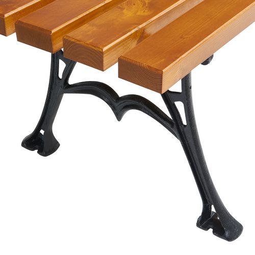 Háttámla nélküli kültéri pad parkba vagy városba. Lucfenyő lécekből készült ülőlappal, több színváltozatban. Fekete színű, stabil fém lábakkal.