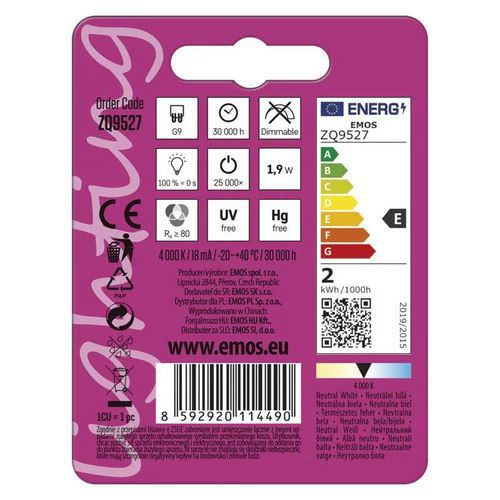Energiatakarékos LED izzók tartós műanyag házzal, G9-es foglalatba. Minimális hősugárzás rendkívül hosszú élettartammal. A flicker-free funkció villogásmentes működést biztosít. Ideális megoldás álmennyezetbe süllyesztett lámpák kiegészítő fényforrásaként vagy dekoratív világításként. 22 W-os halogén izzó kiváltására. Meleg fehér vagy semleges fehér fényű kivitelben kapható. Energetikai osztály