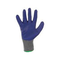 Latex bevonatú kötött kesztyű. Felhasználási javaslat: árumozgatás, építőipari segédmunka. Iparág: építőipar, logisztika, könnyűipar, raktárkezelés. Méret: 8/M, 10/XL Szabványok: EN 420, EN 388 (2121) Anyagösszetétel: 60% pamut 40% poliészter Szín: szürke-kék