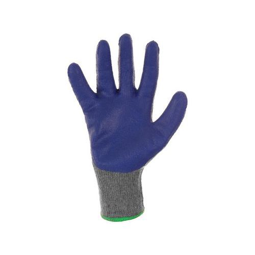 Latex bevonatú kötött kesztyű. Felhasználási javaslat: árumozgatás, építőipari segédmunka. Iparág: építőipar, logisztika, könnyűipar, raktárkezelés. Méret: 8/M, 10/XL Szabványok: EN 420, EN 388 (2121) Anyagösszetétel: 60% pamut 40% poliészter Szín: szürke-kék EN 420 szabvány
