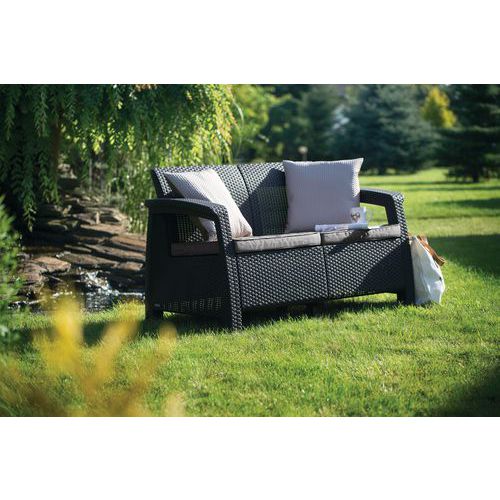 2 személyes kerti kanapé. Egyaránt alkalmas beltérbe és kültérbe. Tartós műanyagból készül. Könnyen mosható és karbantartható. A kanapé súlya je 11,67 kg.