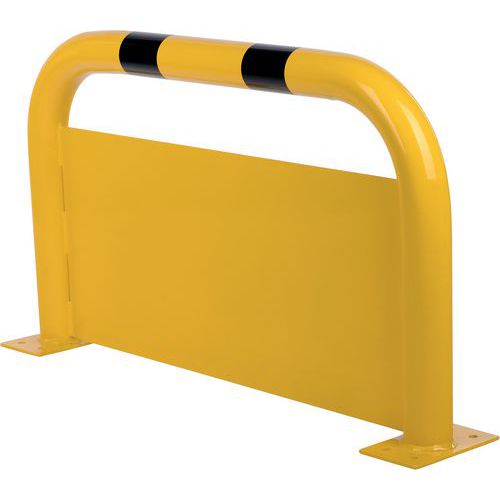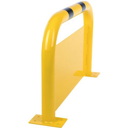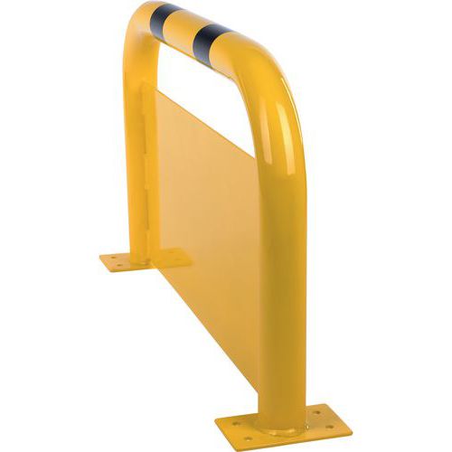 Robusztus acél védőkorlát berendezések vagy gépek anyagmozgató berendezések okozta sérülések elleni védelmére. Aláfutásgátló lemezzel, amely megakadályozza a kocsik ütközését a berendezéssel. Jó láthatóság a sárga-fekete kétszínű kivitelnek köszönhetően. Kizárólag beltéri használatra.