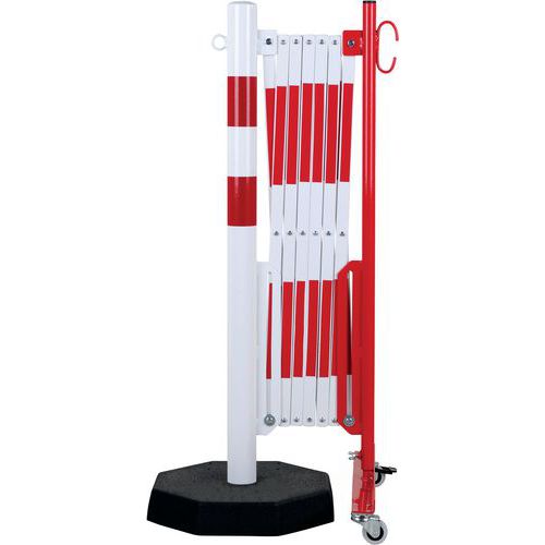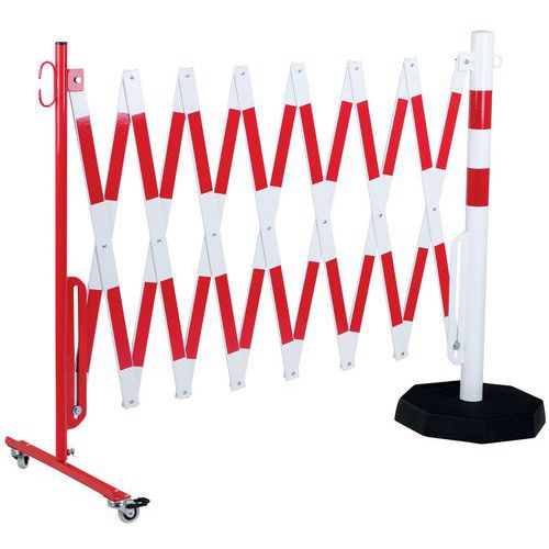 Összecsukható terelőkorlát kerekekkel, egyik oldalon fékekkel, a másikon terelőoszloppal. Lezárt területek ideiglenes kijelölésére szolgál. A terelőoszlop révén olyan helyeken is elhelyezhető terelőkorlát, ahol nem lehet a falra felszerelni. Az oszlop és a talp súlya 8 kg.