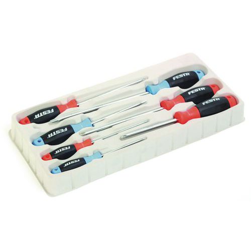 - Hét darabos csavarhúzó készlet CrV acélból, ergonomikusan formázott markolattal a könnyebb fogás érdekében. A csavarhúzók felosztása a készletben kék és piros szín szerint történik, melyek a lapos, ill. a philips kereszt csavarhúzókat jelölik.
