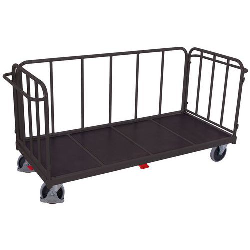 Acél platós kocsi háromfallal. A 800 mm magas fix elülső falak korláttal vannak felszerelve. Levehető oldalfal. Vízálló ragasztott felület csúszásmentes rétegelt lemezből. Rakodási magasság 305 mm. Szürke, nyommentes, termoplasztikus gumi kerekek műanyag felnire szerelve, precíziós golyóscsapágyakkal, vagy elasztikus, teljes gumi kerekek öntött alumínium felnire szerelve, precíziós golyóscsapágyakkal. Vázfelület-kezelés RAL skála szerinti porfestékkel. Ütés- és karcálló. Az EasySTOP központi fékrendszer mindkét forgó kereket bármilyen helyzetben rögzíti a pedál egyszerű megnyomásával. A pedál működtetéséhez nincs szükség munkavédelmi lábbelire vagy védőlábbelire. Teherbírás (kg) : 1200 kg