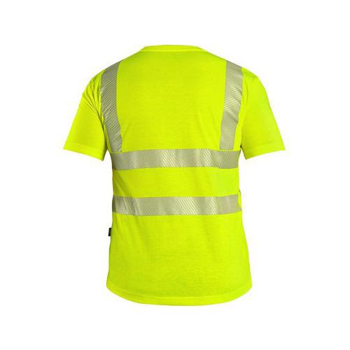 Férfi, jól láthatósági póló rövid ujjúval, kerek nyakkivágással, megerősítő nyakszalaggal, oldalsó varrásokkal, hálós hónaljrészen, szegmentált fényvisszaverő csíkokkal: 2 vízszintes, 2 függőleges (szélesség 5 cm). Ajánlott felhasználás: építőipar, útépítő munkások, sofőrök, logisztika, karbantartás, kerékpárok, motorkerékpárok, tárolás. Fényvisszaverő kiegészítők: Igen Méret: S-4XL
