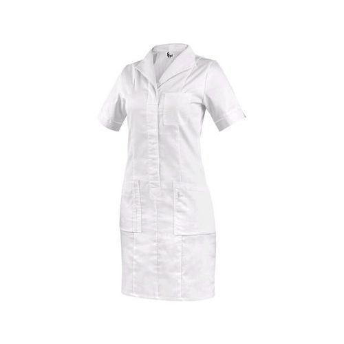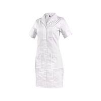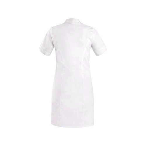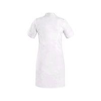 Rövid ujjú női ruha, elöl és hátul hercegnői varrással, kényelmes, nyitott nyakkivágással a nyaknál, térdig érő, fedett babapattanóval, bal oldali mellzsebbel, 2 alsó foltzsebbel, laza alsó szegéllyel. Ajánlott felhasználás: wellness, szépségszalonok, magánrendelők, klinikák és nagy egészségügyi intézmények, gyógyfürdők, szociális intézmények, gyógyszertárak, orvosi szakterületű iskolák. Szabványok: EN ISO 13688 Külső anyag: 62% pamut 35% poliészter 3% elasztán Méret: 38-58