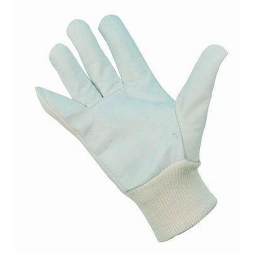 Kombinált munkakesztyű rugalmas kötött kézgallérral. Pamut kézfej rész. A hüvelykujj belső oldala és az ujjvégek fényes kecskebőrből.
