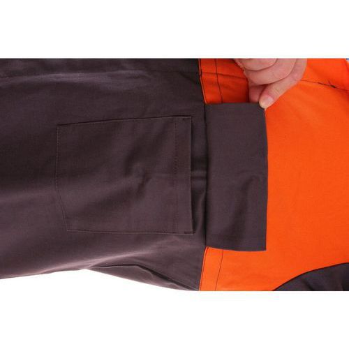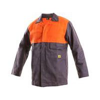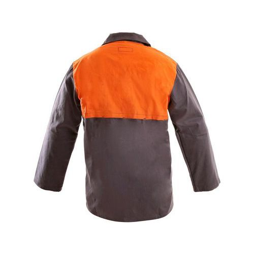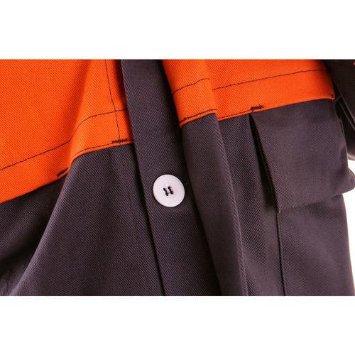 Szürke férfi hegesztő felső narancssárga kiegészítőkkel, véd a kifröccsenő fémolvadékkal szemben. Kis mellső zseb, dupla könyökrész és rejtett gombolás.