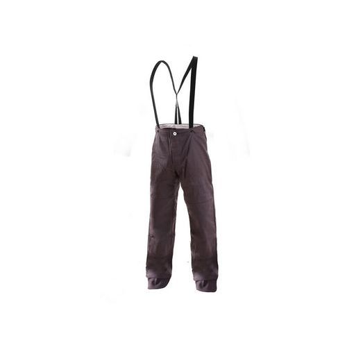 Szürke férfi kantáros hegesztő nadrág. Véd a kifröccsenő fémolvadékkal szemben. Dupla térdrész. A nadrág meghosszabbított eleje részben védi a cipőt is.