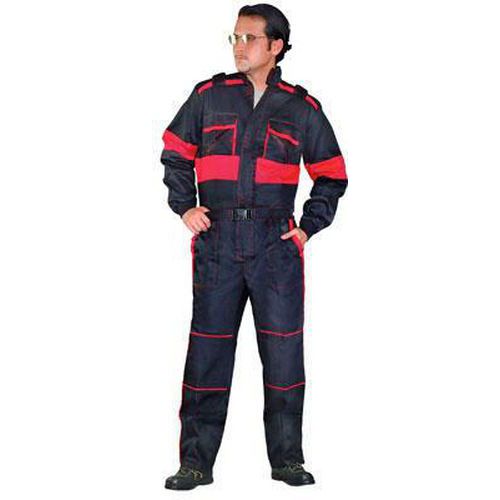 Fekete színű, férfi munkaruha piros kiegészítőkkel. A közepes mellső és a nagy elülső zsebekbe telefon, mérőszalag és a munkához szükséges más apró tárgy tehető. A kényelmes viselést rugalmas derék rész, kapoccsal becsatolható szíj, valamint mandzsettával végződő ujj és lábszár biztosítja. A dupla, merevített térdrész hasznos a gyakori térdelés esetén. Fedett cipzár és gomb a nyaknál. EN ISO 13688: Ez a nemzetközi szabvány meghatározza a védőruházatra vonatkozó általános követelményeket az ergonómia, hibátlanság, méretjelölés, elhasználódás, kompatibilitás, védőruházat jelölés és információk szempontjából, melyeket a gyártó biztosít a védőruházatokkal együtt.