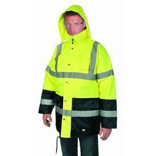 Sárga figyelmeztető fényvisszaverő dzseki kék kiegészítőkkel, magas láthatósággal éjjel és nappal egyaránt. Véd a víz és szél ellen, bélelt. Nyakrészbe rejthető praktikus kapucni. A mellső zsebbe telefon, az elülső zsebekbe a munkához szükséges apró tárgyak tehetők. A dzseki alsó része összehúzható. Rejtett cipzár a nyakig. Fényvisszaverő csíkok a derék részen, ujjakon és a vállakon.