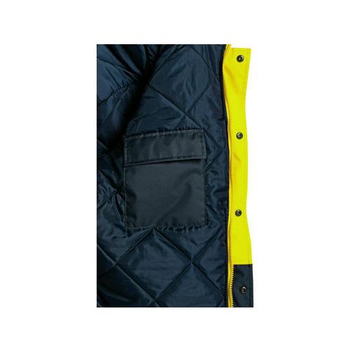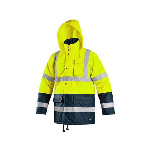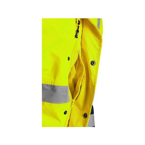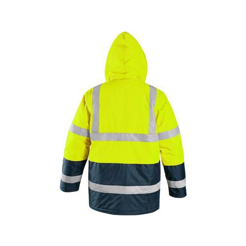 Sárga figyelmeztető fényvisszaverő dzseki kék kiegészítőkkel, magas láthatósággal éjjel és nappal egyaránt. Véd a víz és szél ellen, bélelt. Nyakrészbe rejthető praktikus kapucni. A mellső zsebbe telefon, az elülső zsebekbe a munkához szükséges apró tárgyak tehetők. A dzseki alsó része összehúzható. Rejtett cipzár a nyakig. Fényvisszaverő csíkok a derék részen, ujjakon és a vállakon.