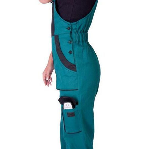 Zöld színű, női munkaruha kertésznadrág fekete kiegészítőkkel.