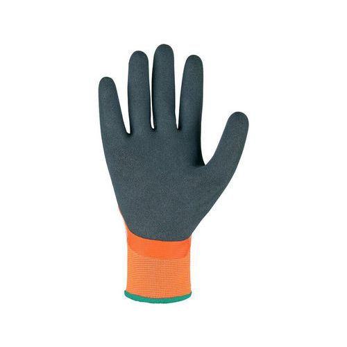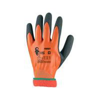 Téli varratmentes kesztyű poliészterből és elasztánból, dupla latex bevonattal, homokszínű felülettel a tenyérrészen a jobb tapadás érdekében, fésült akrilkötésű béléssel, rugalmas mandzsettával, 100 °C-ig védett a kontakt hő ellen.