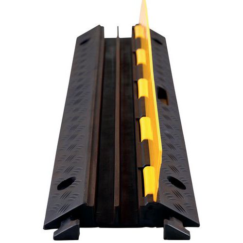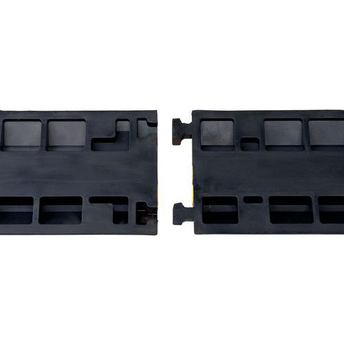 Moduláris kábelhíd védőburkolattal. A modulok a fülekkel egyszerűen és biztonságosan összeszerelhetők. Tömör fekete újrahasznosított gumi robusztus PE fedéllel. Anyagában színezett gumi: ellenáll a hidegnek és a nagy teherbevételnek. Profilozott nút a könnyű átvezetéshez. Gyors és egyszerű összeszerelés 1 személy által, könnyen mozgatható fogantyú segítségével.