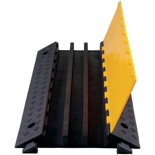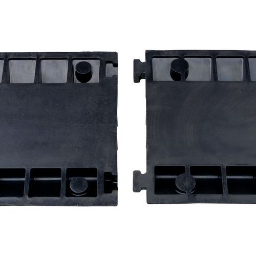 Moduláris kábelhíd védőburkolattal. A modulok a fülekkel egyszerűen és biztonságosan összeszerelhetők. Tömör fekete újrahasznosított gumi robusztus PE fedéllel. Anyagában színezett gumi: ellenáll a hidegnek és a nagy teherbevételnek. Profilozott nút a könnyű átvezetéshez. Gyors és egyszerű összeszerelés 1 személy által, könnyen mozgatható fogantyú segítségével.