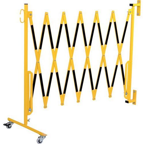 Összecsukható acél korlát, 2 oldalán lábakkal veszélyes területek ideiglenes lezárásához. Váltakozó színei figyelmeztetnek a veszélyre. A korlátok egymással összekapcsolhatók. Szétszedve helytakarékosak.
