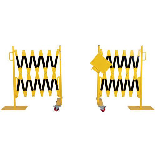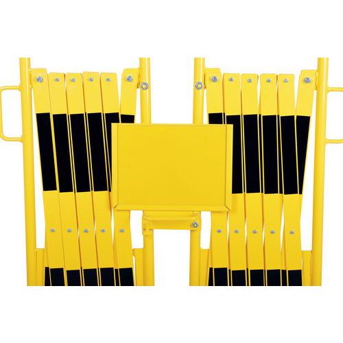 Összecsukható korlát készlet nagy területek ideiglenes lezárására és biztosítására. A középső rögzítő elem nemcsak összeköti a két korlátot, hanem A4-es tájékoztató lap kihelyezésére is alkalmas. Robusztus és stabil: kerekes korlátok fékekkel a biztonságos és egyszerű használat érdekében. Könnyű kezelhetőség a mandzsettáknak köszönhetően.