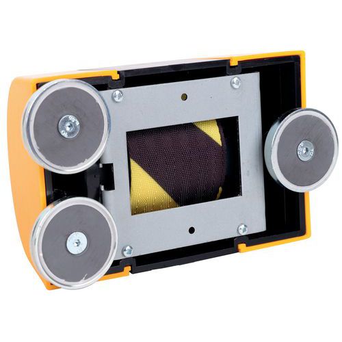 Fali tekercs mágneses szalaggal egy terület lezárásához vagy a bejutás korlátozásához. Könnyű rögzítés a 3 mágnesnek köszönhetően. Kizárólag beltéri használatra. Jó láthatóság a színes csíkozásnak köszönhetően. Egyenként 90 N erejű mágnesekkel. A tok méretei: 143 x 118 x 85 mm.