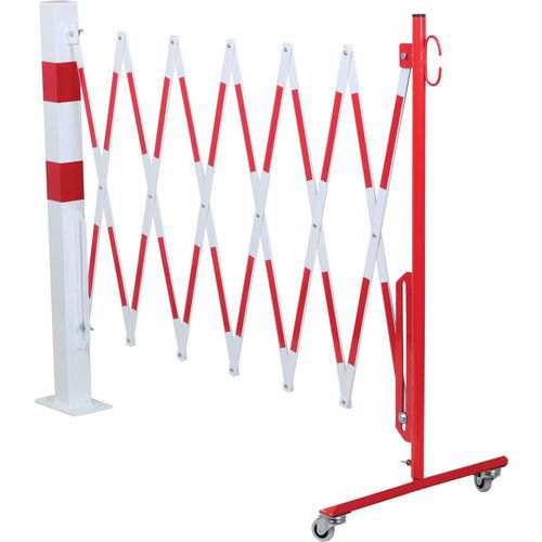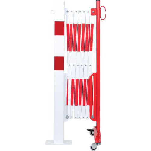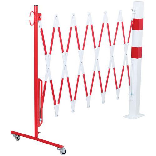 Összecsukható acélkorlát egyik oldalon kerekekkel, a másikon pedig négyszögletes oszloppal. Kétszínű csíkok a jobb láthatóság érdekében. Kizárólag beltéri használatra. Könnyen mozgatható és tárolható a fékezett kerekeknek köszönhetően. 120 x 195 mm-es talplemez.