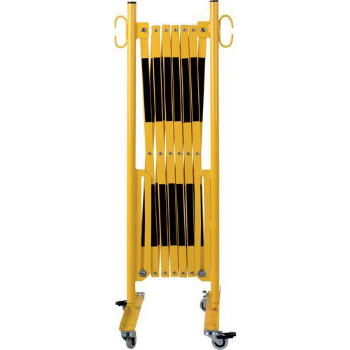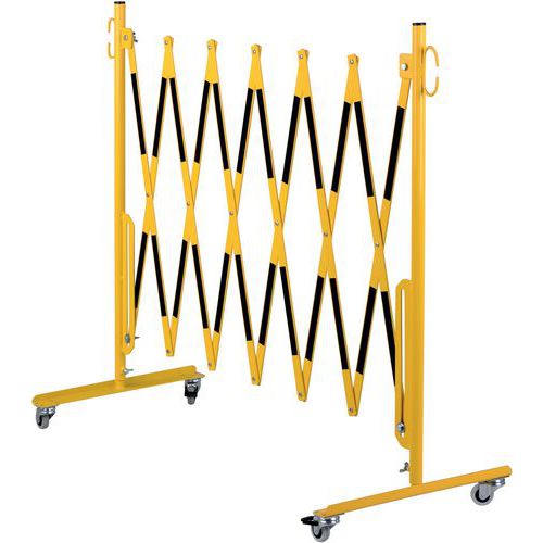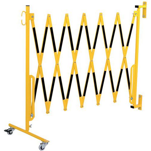 Összecsukható acélkorlát kerekekkel, fali rögzítéssel a forgalom ideiglenes lezárásához. Kétszínű csíkok a jobb láthatóság érdekében. Kizárólag beltéri használatra. Könnyen mozgatható, tárolható és használható a fékezett kerekeknek köszönhetően.