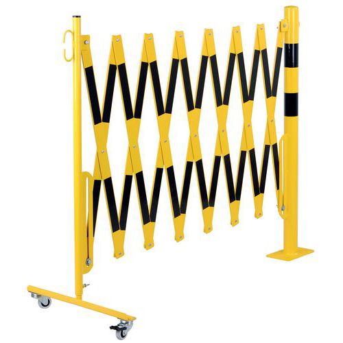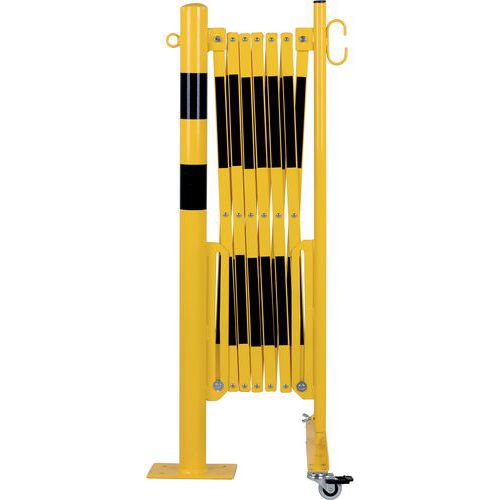 Összecsukható acélkorlát kerekekkel, kerek oszloppal. Kétszínű csíkok a jobb láthatóság érdekében. Kizárólag beltéri használatra. Könnyen mozgatható, tárolható és használható a fékezett kerekeknek köszönhetően. 120 x 195 mm-es talplemez.