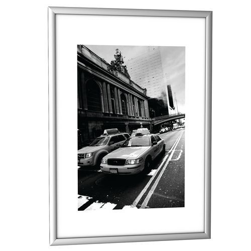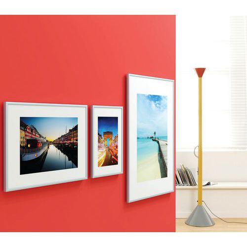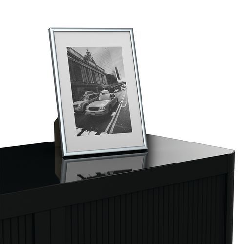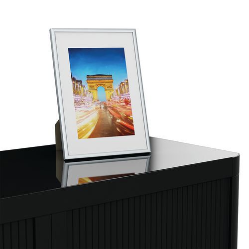 A4-es dekoratív keret, amely álló vagy fekvő helyzetbe is elhelyezhető. Asztalra helyezhető állvánnyal rendelkezik. Stílusos kialakítás, tökéletes fotók vagy poszterek keretezéséhez. 9 mm-es eloxált alumínium keret plexi előlappal. Rögzített 3 mm-es hátlap. Összeszerelve érkezik, könnyen telepíthető.