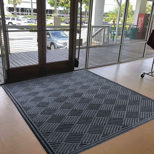 Robusztus bejárati szőnyeg szabadalmaztatott Aqua Dam kialakítással, 4 textilborítású, megerősített szőnyegszegéllyel, amely visszatartó tálcaként működik, és négyzetméterenként akár 4 liter vizet is képes megtartani. A szabadalmaztatott, nem irányított, barázdált gyémánthegyes kialakítású, fröccsöntött textilfelület kettős hatást fejt ki a szennyeződések lekaparására és letörlésére. A masszív gumitalp maximális ellenállást biztosít. A talp alatti csapok minimalizálják a szőnyeg mozgását minden felületen, és megemelik a szőnyeget, hogy a nedves padló megszáradhasson a szőnyeg alatt is.