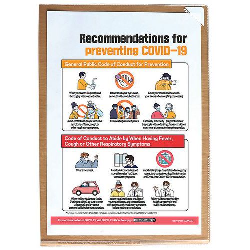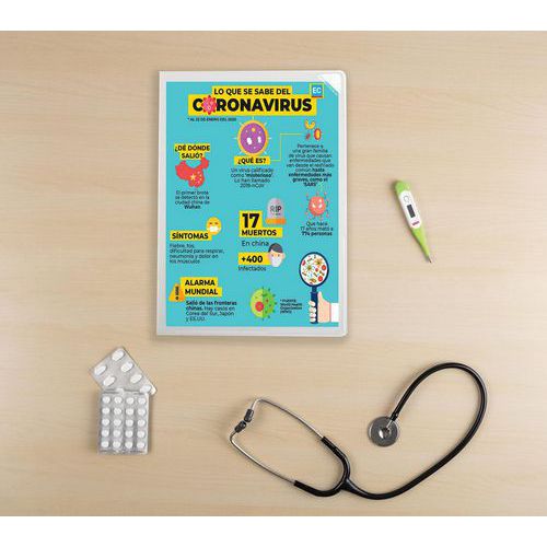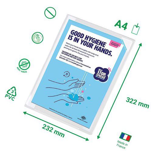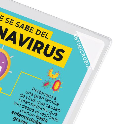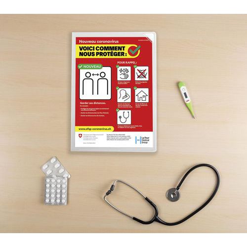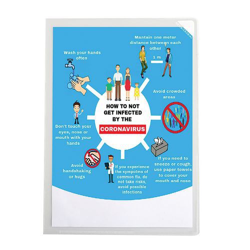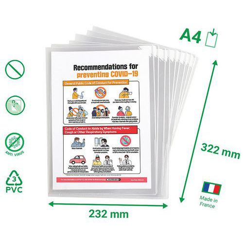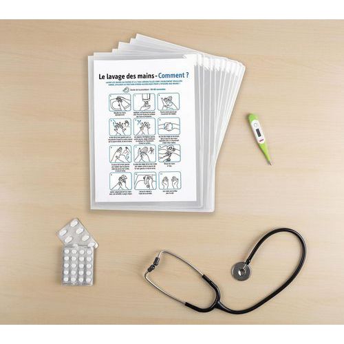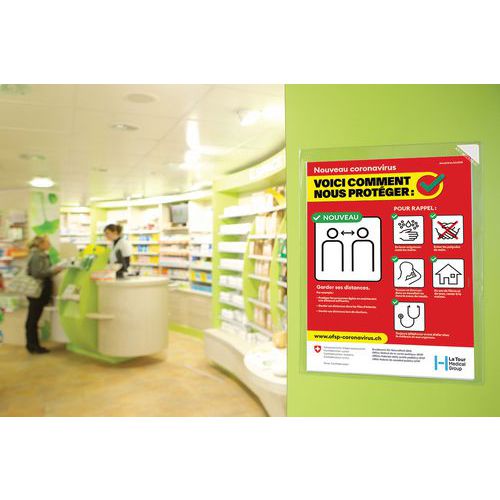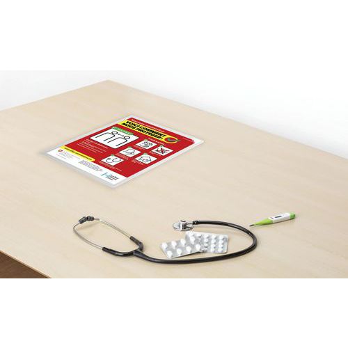 Információs zseb dokumentumokhoz tükröződésmentes bevonattal és áthelyezhető ragasztószalaggal.