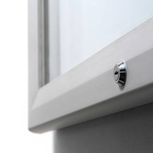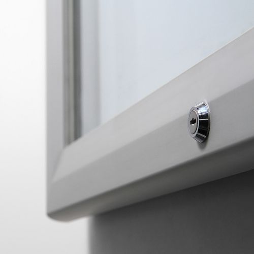 Mágneses vitrinek ezüst alumínium kerettel, alkalmas kültérbe. A lakkozott hátsó fal feliratozható speciális filccel. A vitrin zárható. 4 mm vastag biztonsági ESG üveg. ESG üveg: Speciális, biztonsági keményített üveg - ajtóüvegként vagy autók szélvédőjeként használják. Az EU-ban készült