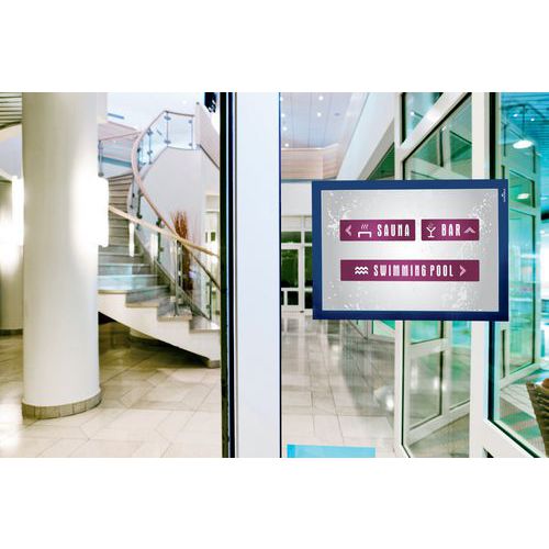 Öntapadós információs keret A4-es méretű dokumentumokhoz. A felhajtható mágneses keret gyors dokumentumbehelyezést és cserét tesz lehetővé. Bármilyen sima felületre könnyen rögzíthető. Üvegfelületeken kétoldalas olvashatóságot biztosít, mivel 2 dokumentum is beilleszthető. A keret azonos kinézetű mindkét oldalról. Fekete, kék, ezüst színben kapható. A látható terület szélessége: 205 mm. A látható terület magassága: 291 mm. Keret szélessége: 17 mm.