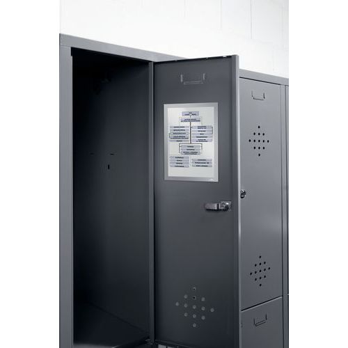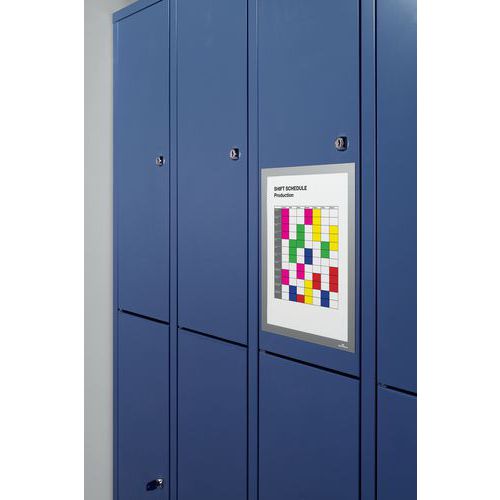 A4-es formátumú mágneses információs keret. Fekete, sárga, zöld, kék, ezüst színváltozatban kapható. Könnyen rögzíthető fémfelületekre (mágnestáblákra, hirdetőtáblákra, fém öltözőszekrényekre, vagy Lean Cube-okra és gyártógépekre is). Álló és fekvő tájolással is használható. Gyors dokumentumbehelyezést és cserét tesz lehetővé. A látható terület szélessége: 205 mm. A látható terület magassága: 290 mm. Keret szélessége: 17 mm. Töltési mennyiség: 2 lap (80 g/m2).
