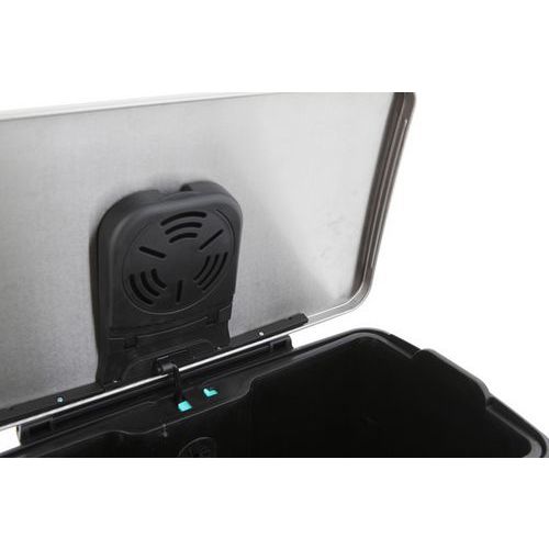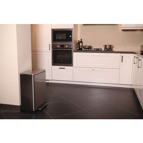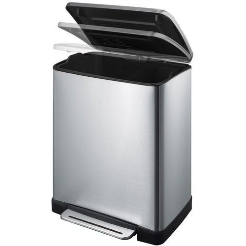Elegáns téglalap alakú pedálos kuka. Extra széles lábpedál. Műanyag belső tároló. Halkan záródó fedél. ujjlenyomat-álló kivitel. A fedél nyitva hagyható a könnyű zsákcseréhez. Tér a fedélben a szaggátló faszénszűrő számára (nem tartozék).
