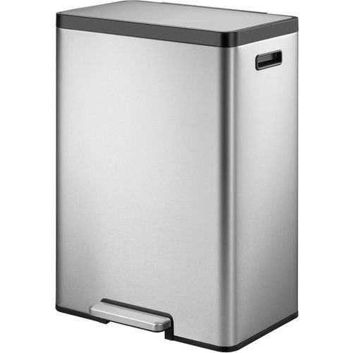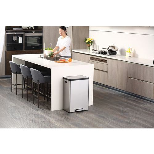 Téglalap alakú pedálos kuka csiszolt rozsdamentes acélból, ujjlenyomat-mentes bevonattal és praktikus műanyag fogantyúkkal. Lágyan záródó fedéllel és két műanyag béléssel (2x20 l) a szelektív válogatáshoz. A stay open funkció a fedelet nyitott helyzetben tartja a bélés könnyű tisztítása és a zsákok cseréje érdekében.