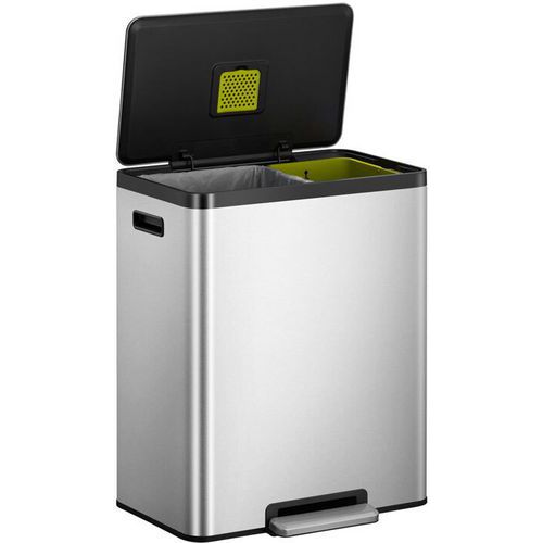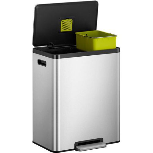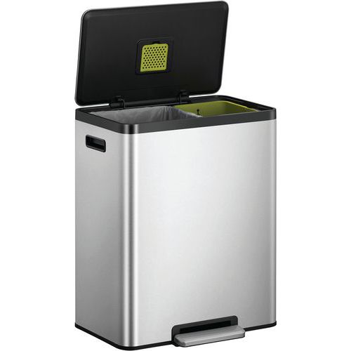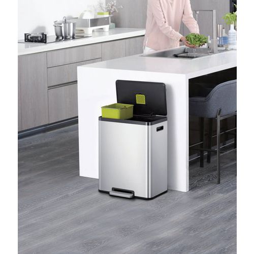 Téglalap alakú pedálos kuka csiszolt rozsdamentes acélból, ujjlenyomat-mentes bevonattal és praktikus műanyag fogantyúkkal. Lágyan záródó fedéllel, beépített szagszűrővel és két szintetikus béléssel (36+24 L) a szelektív válogatáshoz. A stay open funkció a fedelet nyitott helyzetben tartja a bélés könnyű tisztítása és a zsákok cseréje érdekében.