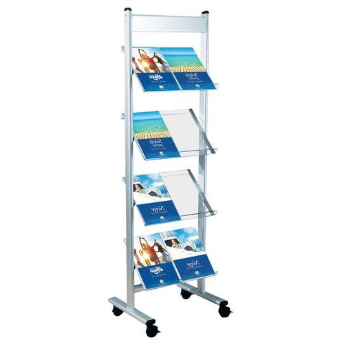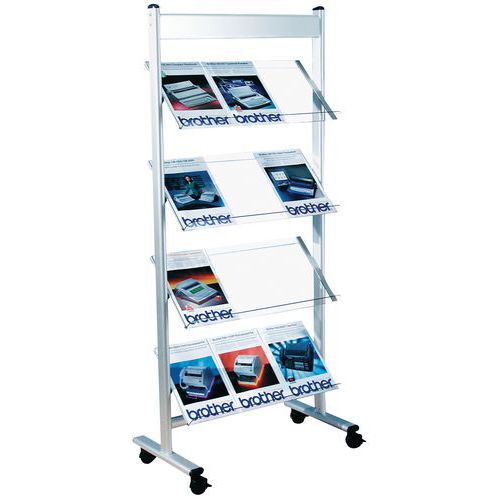 Brosúraállvány acélvázzal. 4 dupla, fékezhető görgővel felszerelve. Akrilüveg polcok.