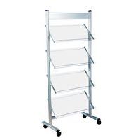 Brosúraállvány acélvázzal. 4 dupla, fékezhető görgővel felszerelve. Akrilüveg polcok.