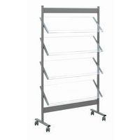 Brosúraállvány acélvázzal. 4 dupla, fékezhető görgővel felszerelve. Akrilüveg polcok.