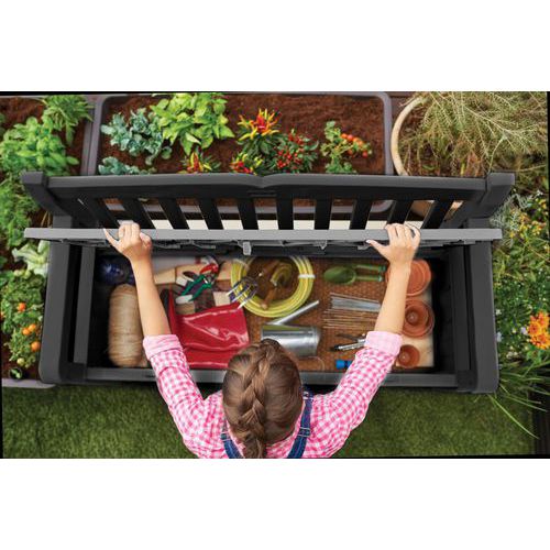 Elegáns kialakítású, elegáns pad a kertbe vagy a teraszra. Az ülés alatt 265 l térfogatú tárolóhelyiséggel felszerelve, így tárolhatja az ülőpárnákat, takarókat stb. A fa utánzatú műanyag felületnek köszönhetően a pad tökéletesen illeszkedik minden kertbe. Időjárás- és UV-álló, könnyen karbantartható. Gyors és egyszerű összeszerelés szerszámok nélkül. A pad méretei: (h x b x t) 96,3 x 139 x 59,4 cm.