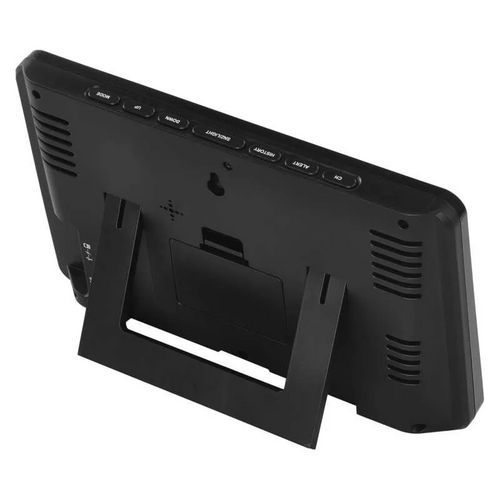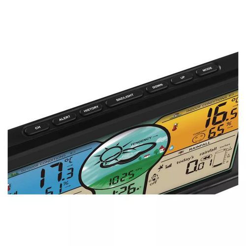Beállítható csapadék- és kültéri hőmérsékletriasztással, valamint a légnyomás-, hőmérséklet- és páratartalom mérési adatait megjelenítő animált grafikonnal.
