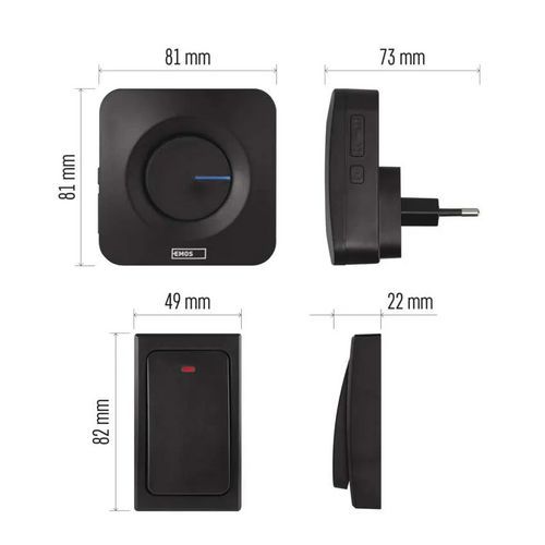 A csengő méretei: 73 x 73 x 81 mm, a nyomógomb méretei: 22 x 49 x 82 mm.
